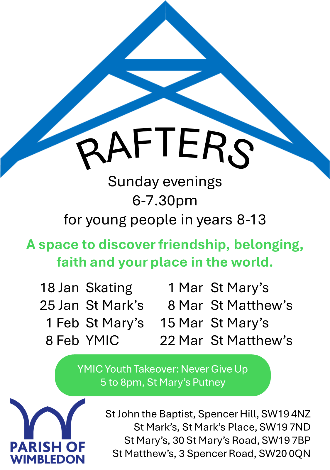 Rafters is our Parish Youth Group, now led by Nequela, our Parish Youth lead. Please find below our Jan - March 2026 meetings. For further information please email youth@parishofwimbledon.org.uk